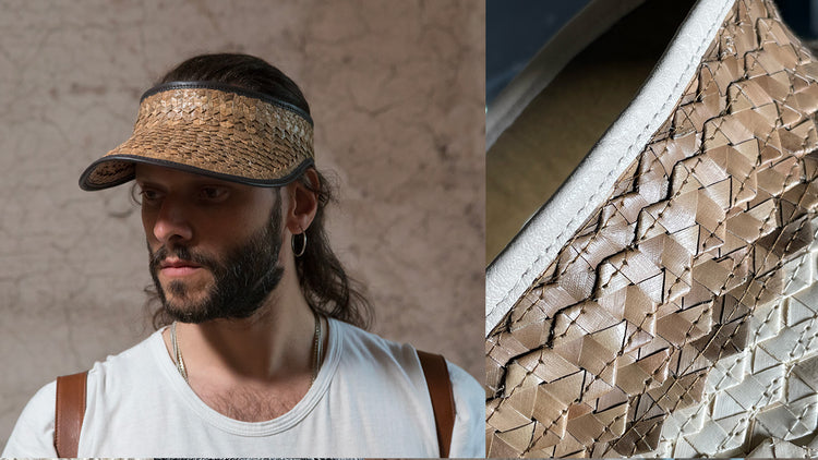 la nostra visiera in foglia di palma intrecciata a mano, rifinita in pelle