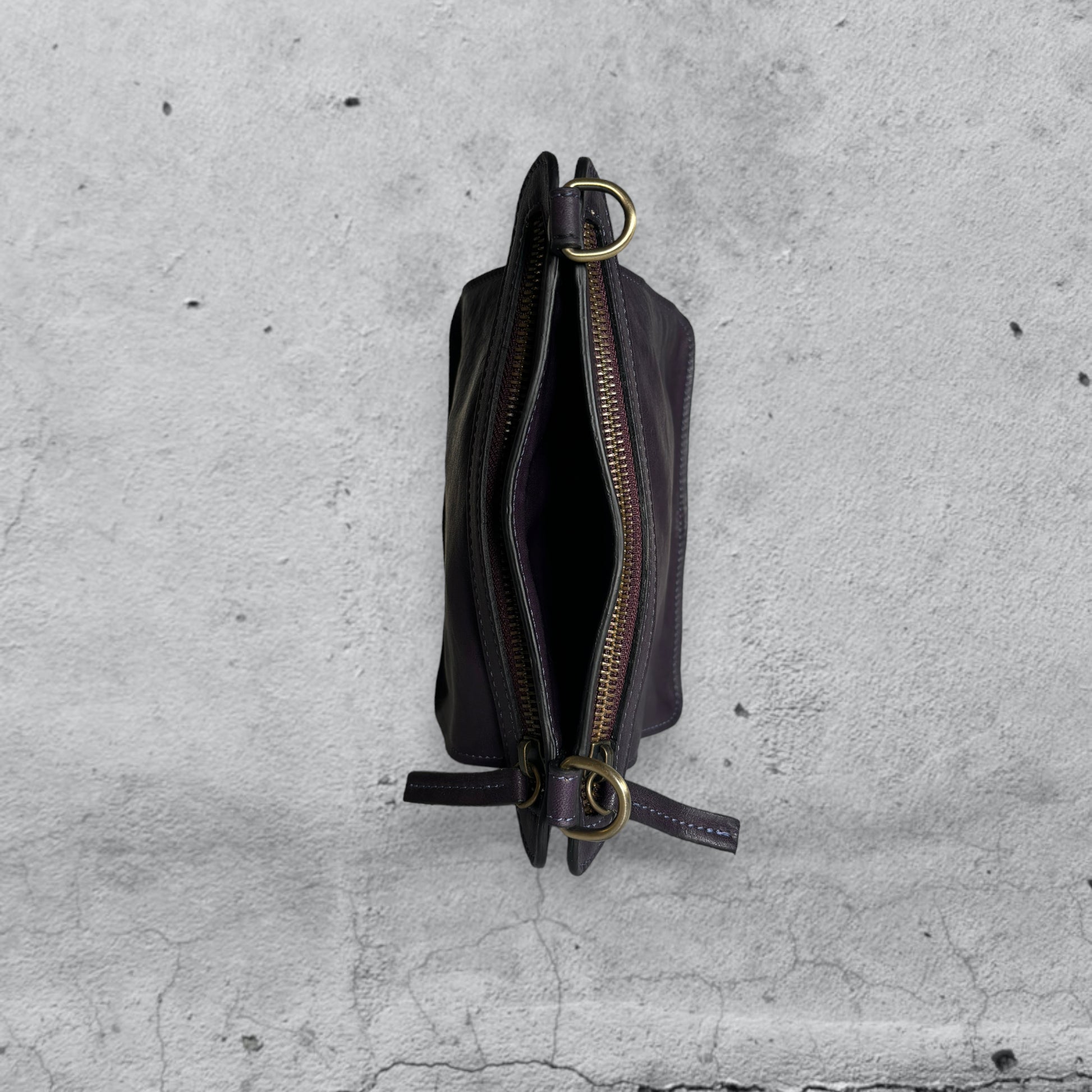 Calix è una borsa in pelle dalle misure contenute, costruita a soffietto è dotata di doppia zip e di una tasca al centro.